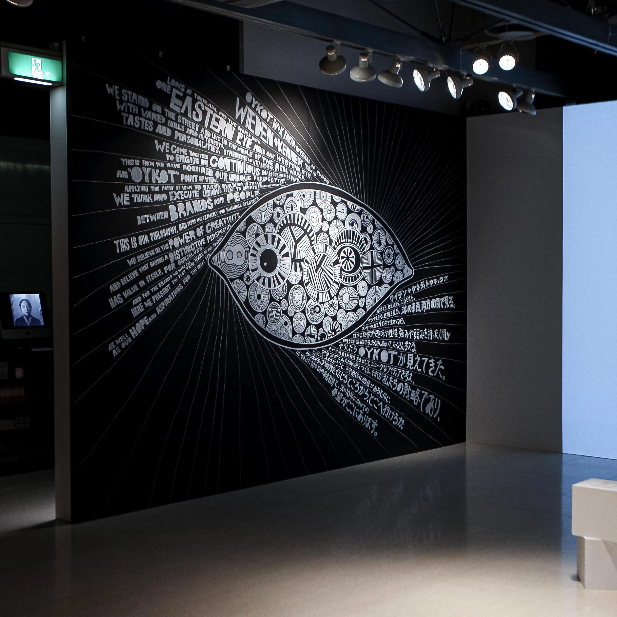 Our contributions to this exhibition are the notable mural that celebrated W+K Tokyo’s hybrid Japanese + Western culture, and the distinctive looping video installation that depicted an ever-changing face contracted using the facial parts of W+K Tokyo members.